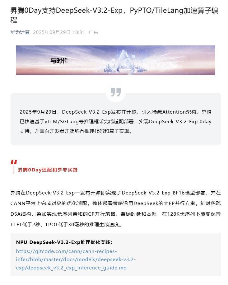 据“华为计算”微信公众号消息至尊配资,昇腾已快速基于vLLM/SGLang等推理框架完成适配部署,实现DeepSeek-V3.2-Exp 0day支持,并面向开发者开源所有推理代码和算子实现。
