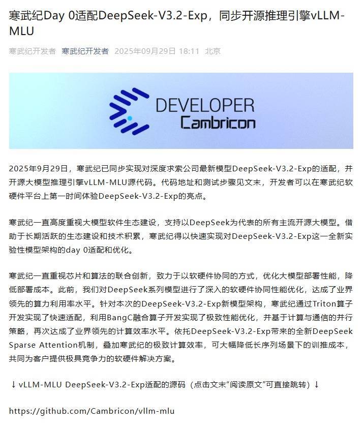 寒武纪在官方微信号宣布,已同步实现对深度求索公司最新模型DeepSeek-V3.2-Exp的适配,并开源大模型推理引擎vLLM-MLU源代码。依托DeepSeek-V3.2-Exp带来的全新DeepSeek Sparse Attention机制,叠加寒武纪的极致计算效率,可大幅降低长序列场景下的训推成本。