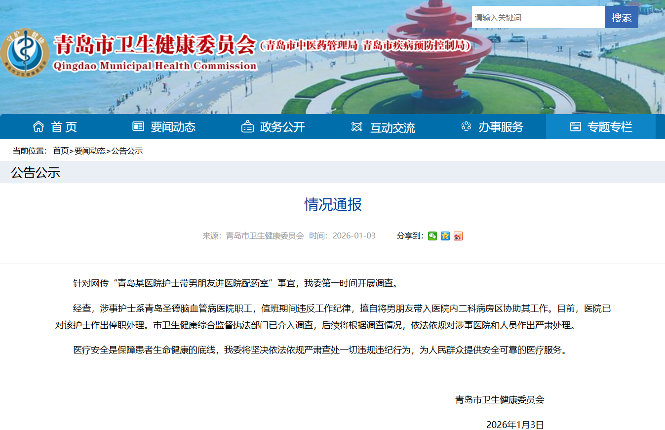 1月3日,青岛市卫生健康委员会发布情况通报称,针对网传“青岛某医院护士带男朋友进医院配药室”事宜,该委第一时间开展调查。