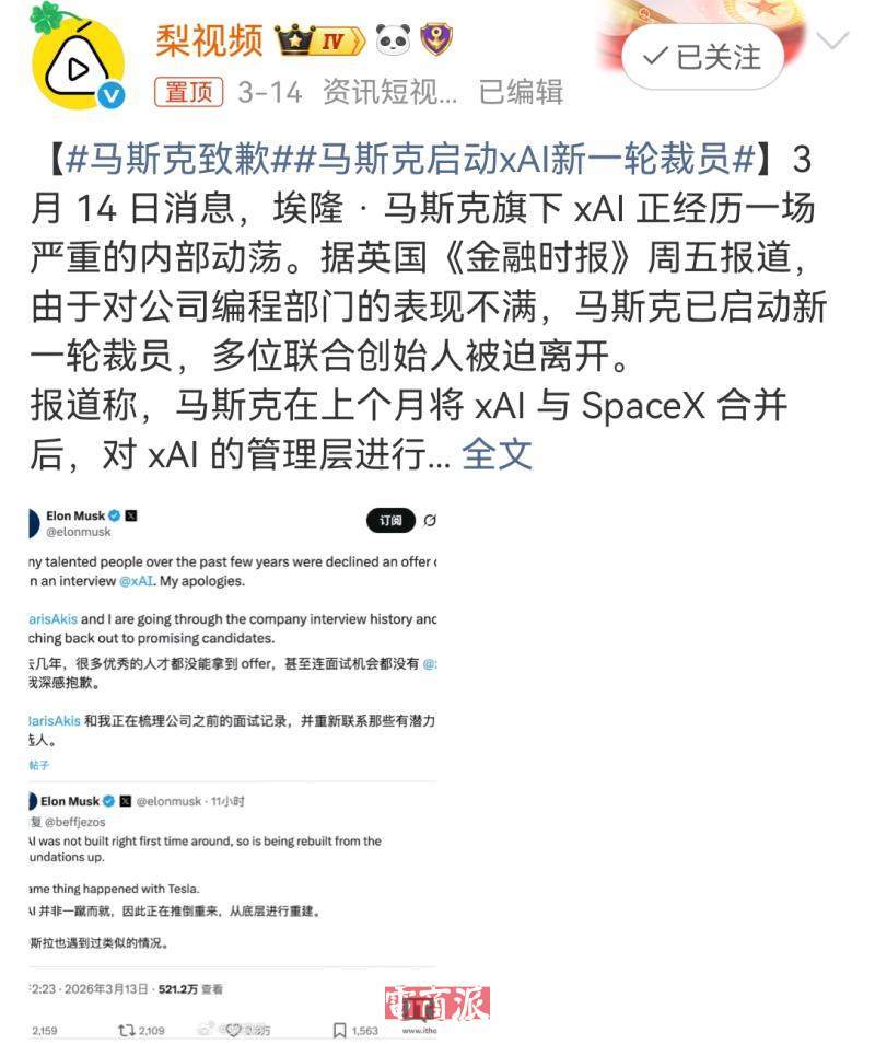 3月14日,有消息披露,马斯克对xAI编程部门的进展表示不满,启动了新一轮内部裁员。在这一背景下,多位联合创始人被迫离开。