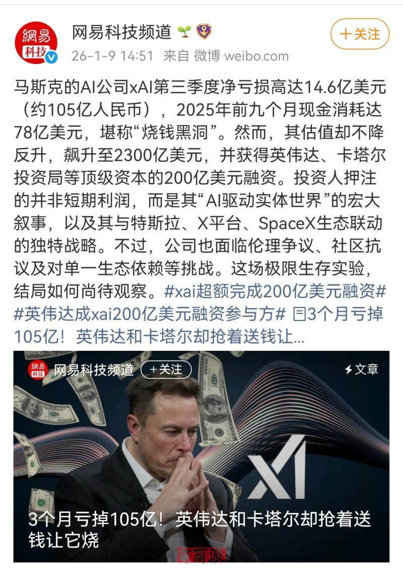 市场分析指出,2025年第三季度,xAI净亏损高达14.6亿美元,前三季度累计现金消耗达78亿美元,亏损节奏远超一家初创公司的正常范畴。