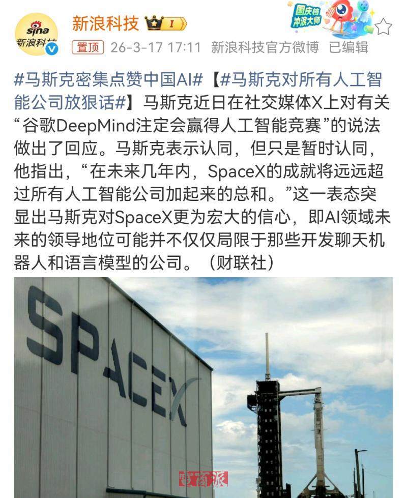 近日,有人在X平台上发帖称“谷歌DeepMind注定会赢得人工智能竞赛”,马斯克转发并表示认同,但他随即补充道:“我同意——暂时。”紧接着他又加了一句:“未来几年,SpaceX的成就将远远超过所有人工智能公司加起来的总和。”