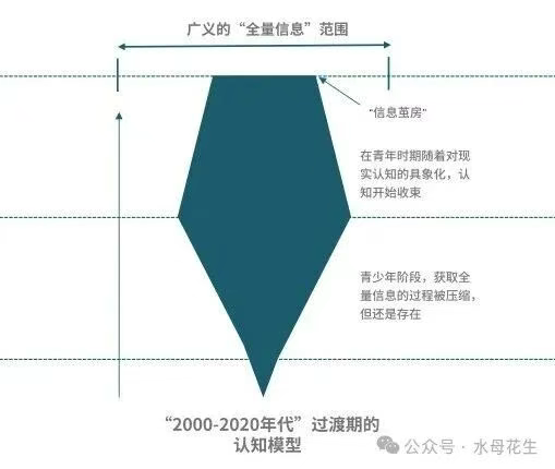 于是,出生于1988-1998年代左右的一代人(也就是国内的最后一次“婴儿潮”时期),他们的成长认知模型,达到了“倒三角结构”下的最终形态——童年时期由书籍和电视启蒙,少年时期初步接触到互联网(以及游戏),青少年时期随着互联网技术发展而成长,进入大学到刚毕业青年时期刚好赶上智能手机普及与爆发,在进入社会后的五年期间里见证了流媒体、社交网络、短视频等新媒介的诞生与普及,在今天即将步入壮年的时代开始接触Ai这一完全实现信息平权的技术。这是一套理论上完美的“人的认知增长伴随着科技进步而共同成长”的认知发展过程。